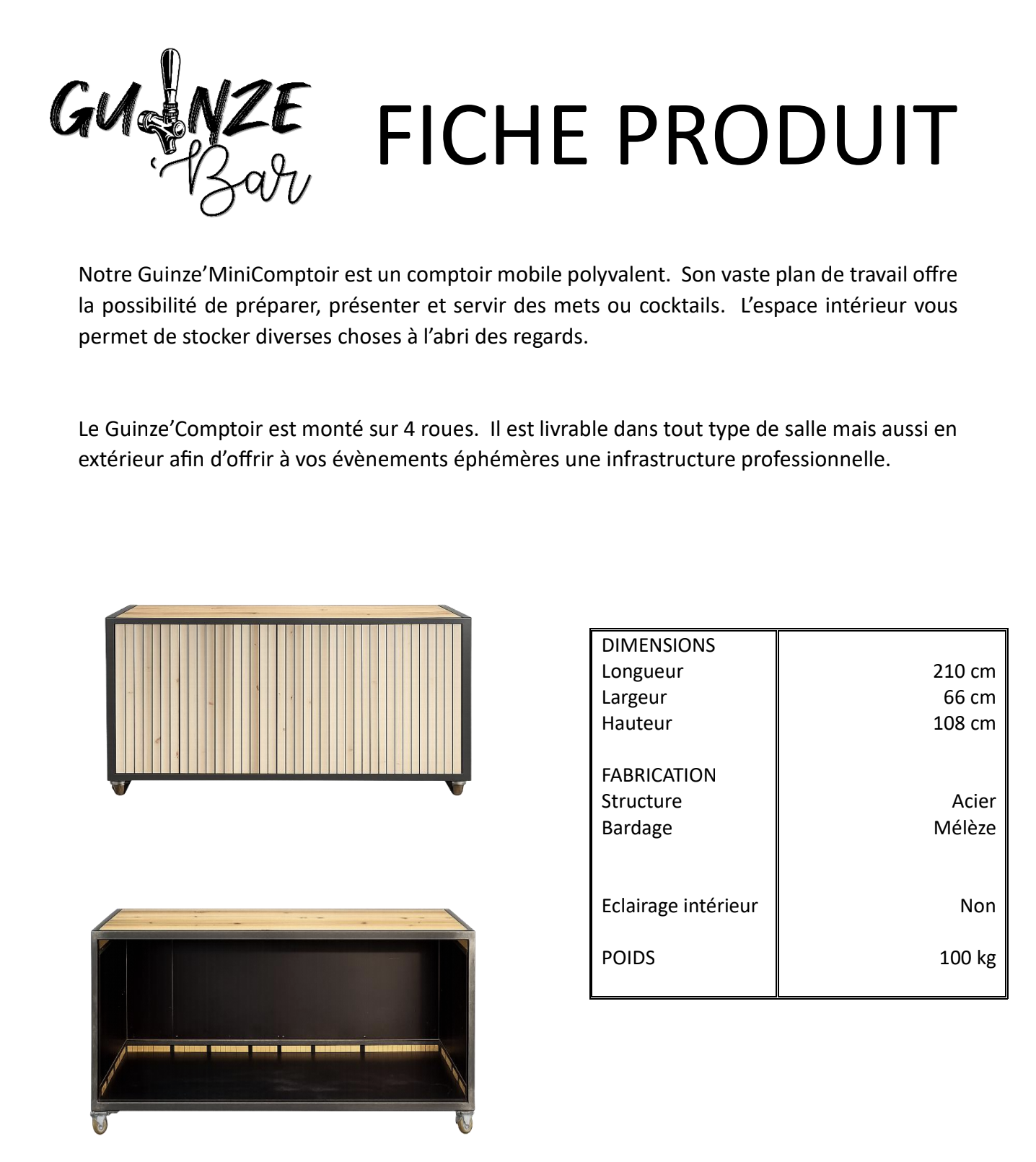 Notre Guinze’MiniComptoir est un comptoir mobile polyvalent. Son vaste plan de travail offre la possibilité de préparer, présenter et servir des mets ou cocktails. L’espace intérieur vous permet de stocker diverses choses à l’abri des regards.